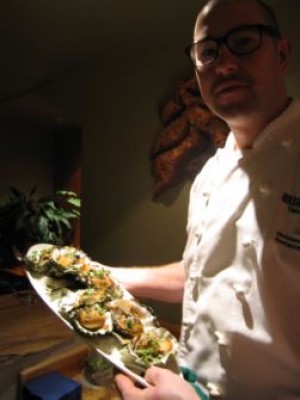 Place the garnish in the sweet corn nage, top it with your potato-crusted oysters, and enjoy our West Coast bounty!